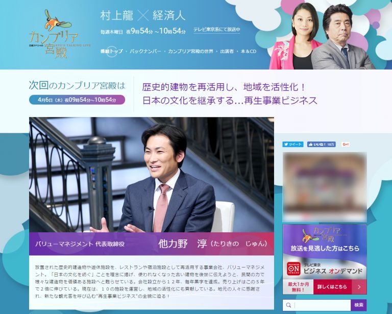 4/6(木)21:54~放送のテレビ東京「カンブリア宮殿」にて、 当ホテルを運営する弊社バリューマネジメントが特集されます。 歴史的建造物を宿泊施設・レストラン・婚礼事業に活用し、日本文化を継承する「再生事業ビジネス」の裏側、躍進の秘密を徹底解明。代表の他力野 淳がトークドキュメンタリーでたっぷりと語ります。ぜひご覧くださいませ。 ■ 放送内容 テレビ東京「カンブリア宮殿」 内容:歴…