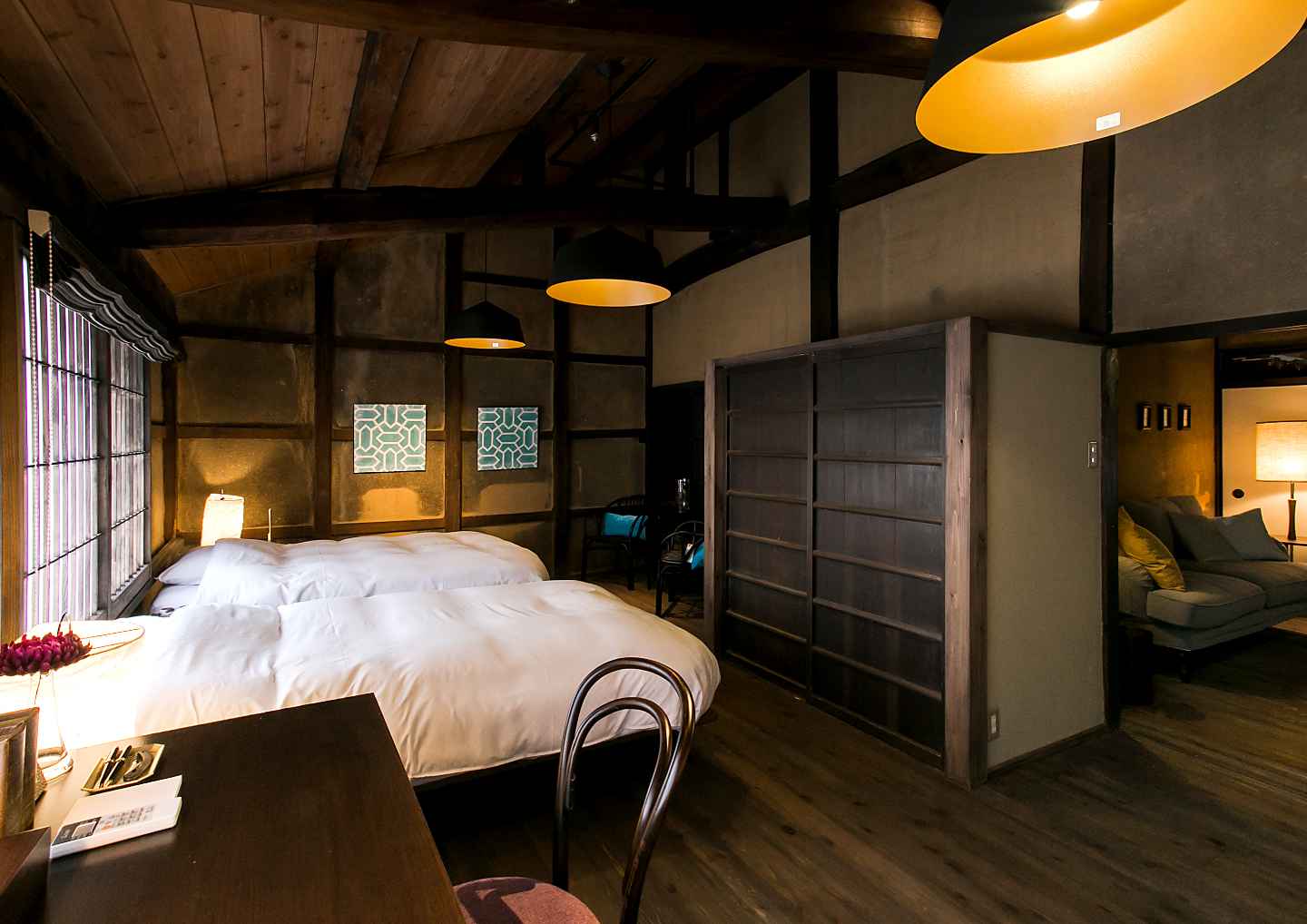 土間や梁、土壁の風合いや、メゾネットならではの隠れ家のような雰囲気など、「歴史建築に泊まる」体験を存分に満喫できるお部屋。もとの特徴を生かしたユニークな造りながら、モダンに改修され、快適にお過ごしいただけます。