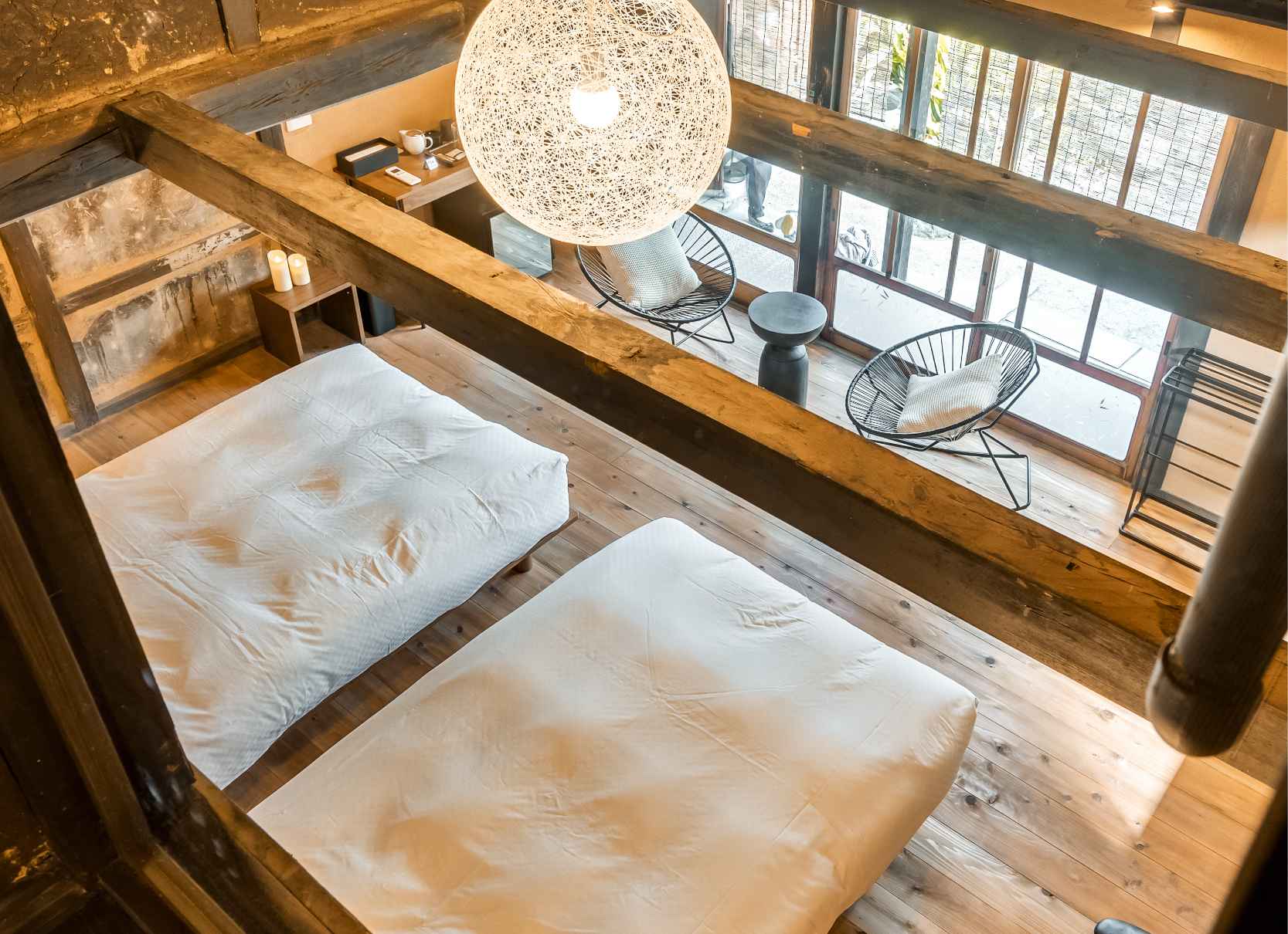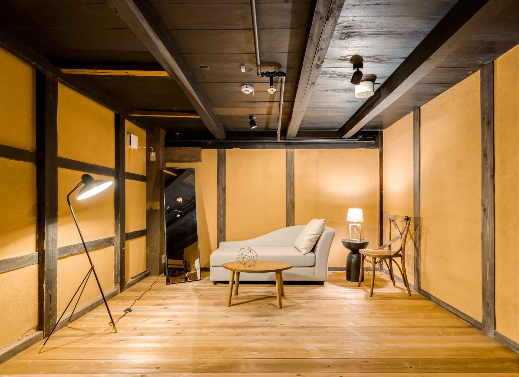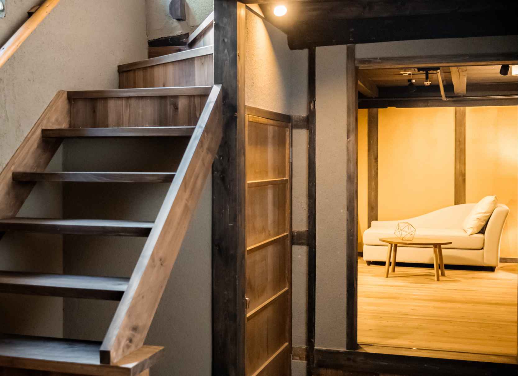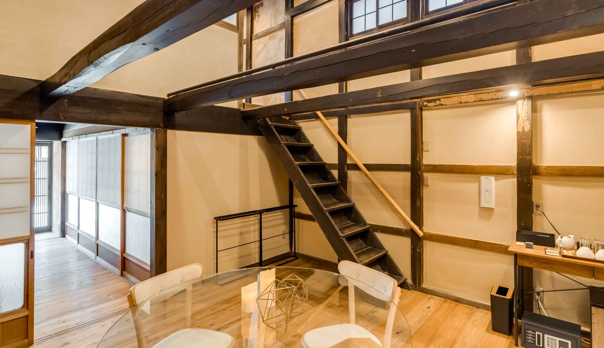 土間や梁、土壁の風合いや、メゾネットならではの隠れ家のような雰囲気など、「歴史建築に泊まる」体験を存分に満喫できるお部屋。もとの特徴を生かしたユニークな造りながら、モダンに改修され、快適にお過ごしいただけます。