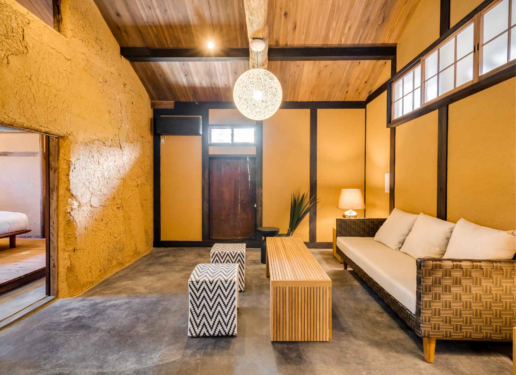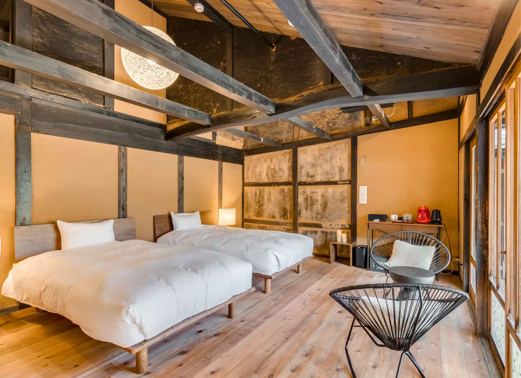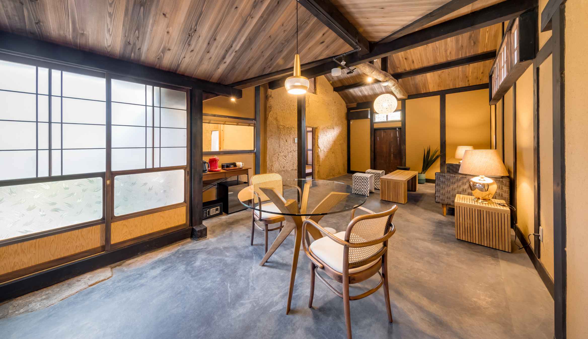 土間や梁、土壁の風合いや、メゾネットならではの隠れ家のような雰囲気など、「歴史建築に泊まる」体験を存分に満喫できるお部屋。もとの特徴を生かしたユニークな造りながら、モダンに改修され、快適にお過ごしいただけます。
