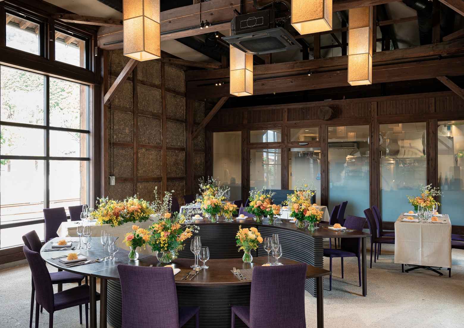 国の文化財に指定されている、明治期に築造された発酵蔵を改修したダイニングがパーティ会場に。天井から覗く大きな梁や土壁が世紀を越えて、この場所で紡がれてきた歴史を物語ります。歴史の息吹を感じる、懐かしくも新しい空間がおふたりの門出の一日を彩ります。