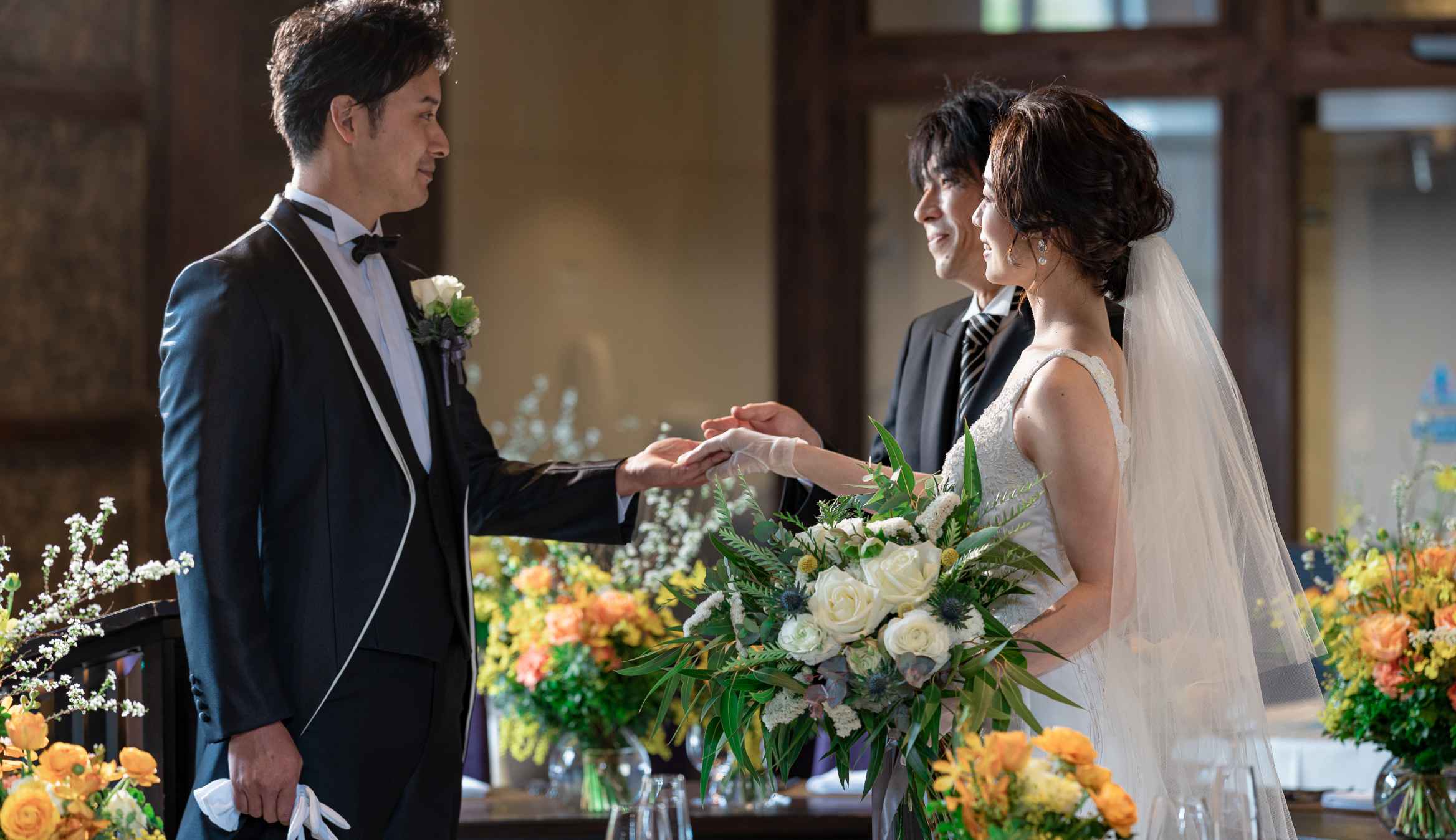 ご出席いただいたゲストの皆様に向けて誓いを立てる宴内人前式。館内で全て行えるため、挙式の感動はそのままにスムーズにパーティへ。和装では、日本の古式ゆかしい雰囲気を大切にしつつ、演出やアイテムはおふたりらしさを織り交ぜたオリジナル和婚式も可能。おふたりらしさを表現できる演出を多彩に入れ込んだ唯一無二の挙式に。