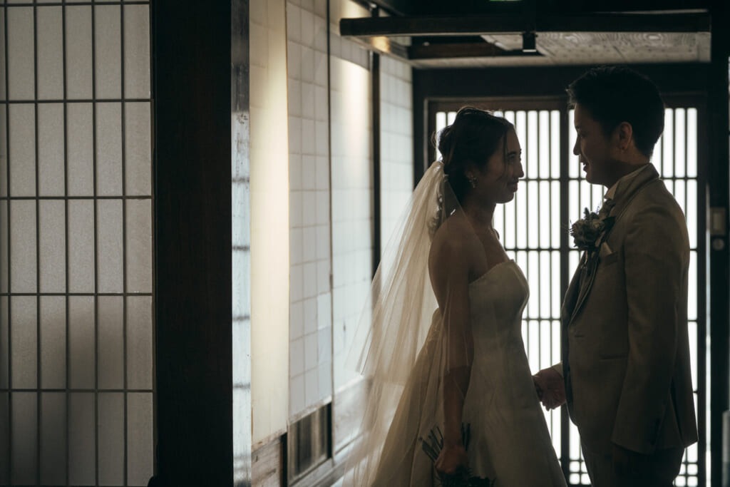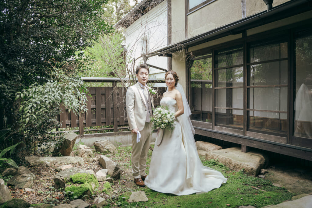 竹田城 城下町 ホテルENにただよう、落ち着いた雰囲気や緑豊かなガーデンに魅力を感じてくださったおふたり。ご両家からのアクセスもほどよい場所だったことから、ENでの結婚式をお決めくださいました。さらに、オンラインでお打合せができることも一つの決め手に。海外にいながらでも、スムーズに結婚式の準備を進めていただけます。