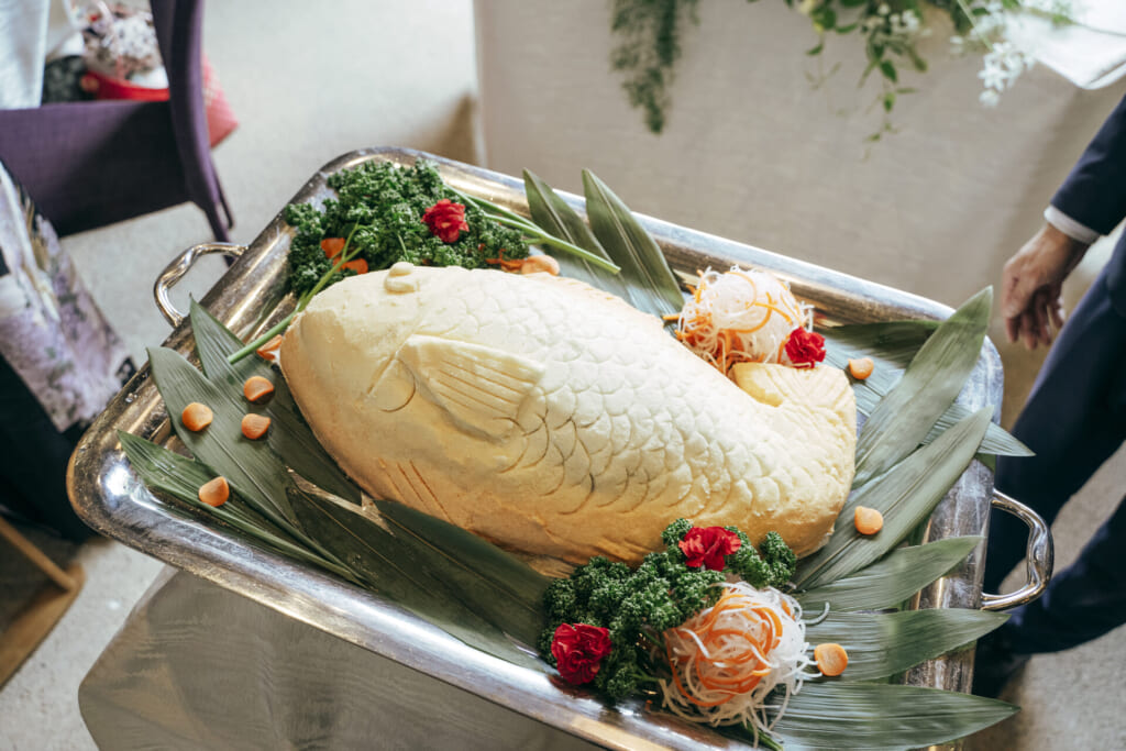 披露宴会場にご入場されたおふたりを、盛大な拍手でお迎えくださったゲストの皆様。ご両家の親交を深める宴が、華やかにスタートしました。インパクトと記憶に残る演出として、おふたりが取り入れられたのは鯛の塩釜開き。皆様の「よいしょ」の掛け声とともに、新郎様新婦様に鯛を開いていただきました。会場のおめでたいムードと一体感がさらに高まり、印象に残るひとときに。開かれた鯛は、鯛茶漬けにして皆様に振舞われました。地場産の食材をふんだんに使用したお料理にも舌鼓を打たれ、会話と笑顔を弾ませる皆様。会場は、幸福と喜びに満ち溢れていました。