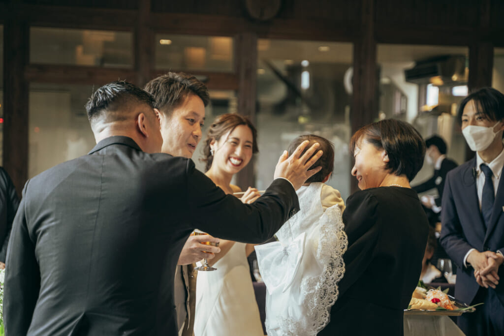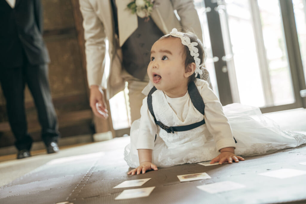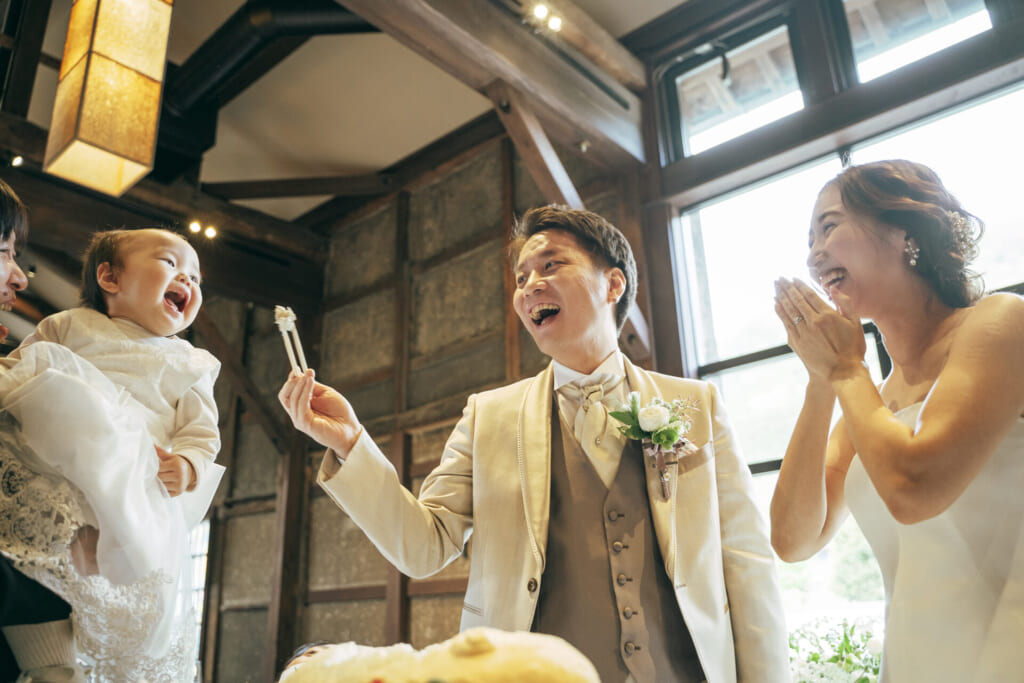 お子様の1歳のお誕生日を祝い、これからの健やかな成長を祈って、“一生餅”をご用意されたおふたり。小さな背中に重い一生餅を背負いながらも、満面の笑みを浮かべたままの愛らしいお子様のお姿に、皆様の視線が釘付けに。お子様の将来を占う“選び取りカード”では、お子様のご選択をあたたかく見守られていました。1歳のお誕生日というお子様の特別な節目を、ご両家で盛大に祝福された皆様。この瞬間を何度でも振り返りたくなるような、思い出深いひとときを過ごされました。