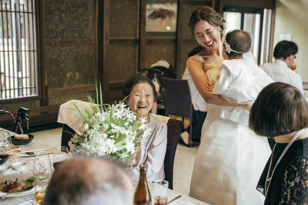 当初は、ご両家の顔合わせを意識したシンプルな会食を思い浮かべられていたおふたり。お打合せを重ねていくうちに、おふたりのイメージやこだわりが少しずつ膨らんでいきました。1歳を迎えるお子様のお誕生日を祝う演出や、おふたりらしさやゲスト愛を表現したペーパーアイテムなどを取り入れ、おふたりが思い描く理想を徐々にカタチに。ご家族中心の結婚式だからこそ、アットホームな雰囲気でリラックスして楽しむ一日をイメージされながらご準備くださいました。