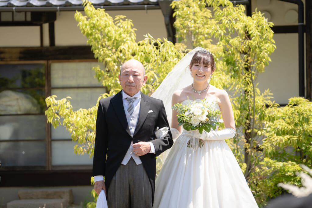 その場の雰囲気がパッと明るくなるような、気さくなお人柄の新郎様新婦様。出会う人みなを笑顔にする、ユーモアたっぷりで息の合ったおふたりの空気感が印象的でした。結婚式を通して、親御様に感謝の気持ちをお伝えし、晴れ姿をお披露目したい。また、ご家族の皆様に見守っていただきながら夫婦になる約束を交わすことで、親御様を安心させたい。そういったおふたりの想いを形にしてお届けするために、挙式を決意なさいました。
