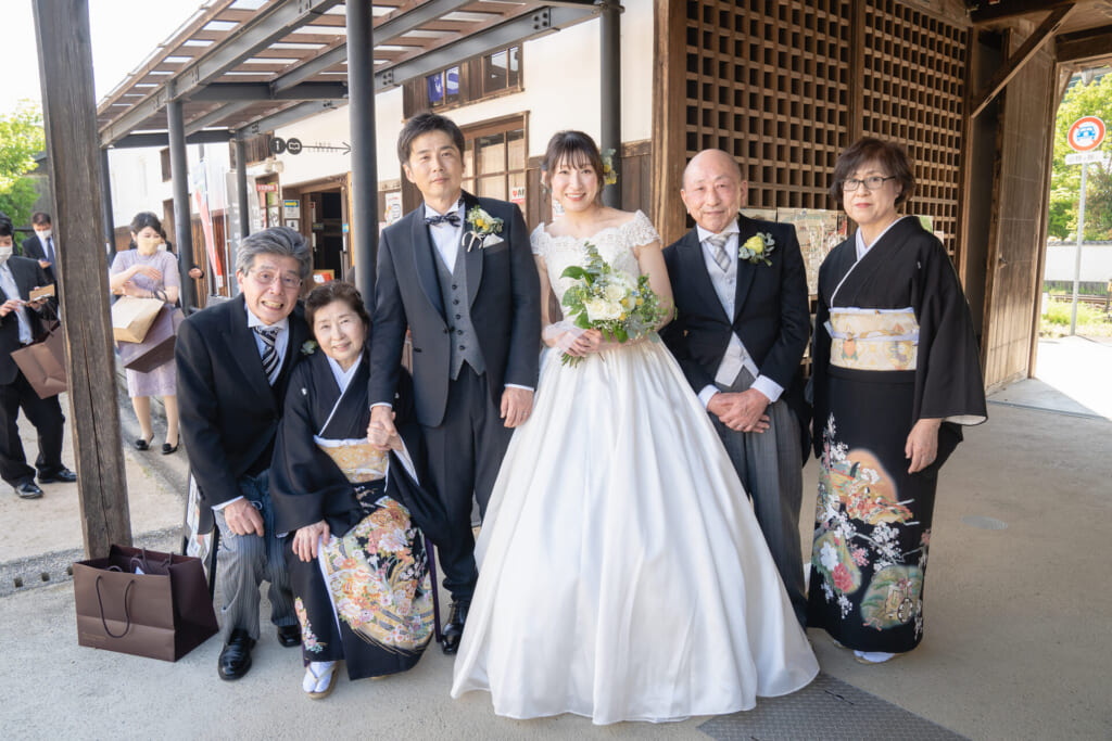 ご披露宴では、新婦様のお父様に詩吟をご披露いただきました。ご披露されたあとは会場中が盛大な拍手に包まれ、熱気が高まりました。ご家族中心の式だからこそ、賑やかでアットホームな雰囲気が自然と作り上げられていきました。おふたりの満面の笑みが浮かぶ幸せいっぱいなファーストバイトのあと、ご両家の親御様によるバイトも執り行われることに。サプライズで親御様をお呼びしたところ、照れながらもどこか嬉しそうな表情でケーキの前へお立ちになりました。ご両家の親御様の仲睦まじさが伝わってくる、とても素敵なひとときでした。