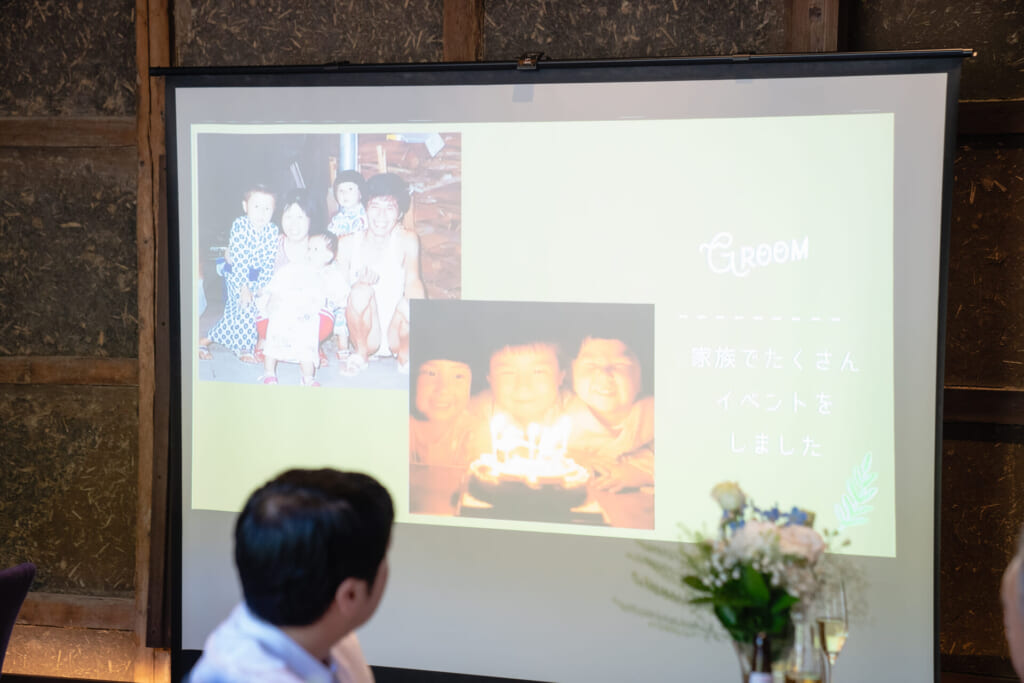 スクリーンに映し出されたエンディングムービーでは、前撮りのお写真をお披露目なさいました。前撮りでは和装衣裳をお召しになり、当日とはまたちがう雰囲気の新郎様新婦様のお姿に、会場の皆様の目が釘付けに。こちらまで明るい笑い声が届いてきそうなおふたりのはじける笑顔が、これからのおふたりの明るい未来を象徴するかのようでした。